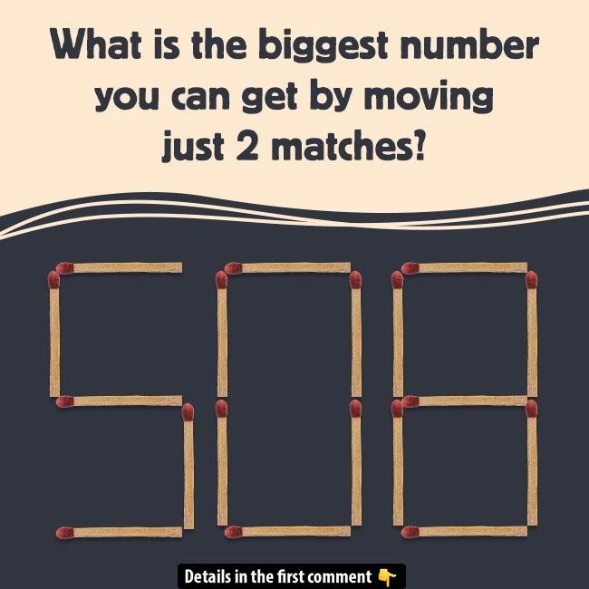 Here’s a fun and tricky puzzle for you! Take a look at the number 500 formed by matchsticks. The challenge is simple: What’s the biggest number you can make by moving just 2 matches?