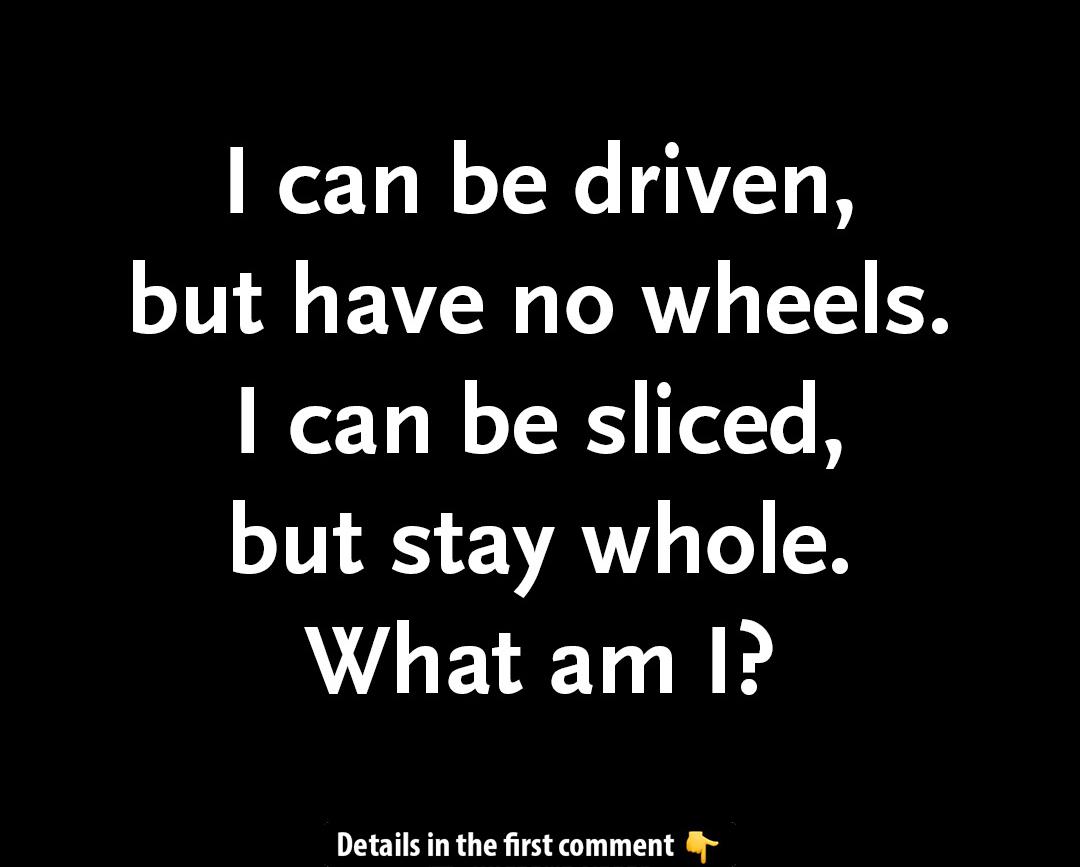 Are you up for a challenge? Here’s a tricky riddle to test your thinking: “I can be driven, but have no wheels. I can be sliced, but stay whole. What am I?” Think you know the answer? Keep reading to find out if you’re right, and don’t forget to share your thoughts in the comments below! Let’s see if you can crack this one!